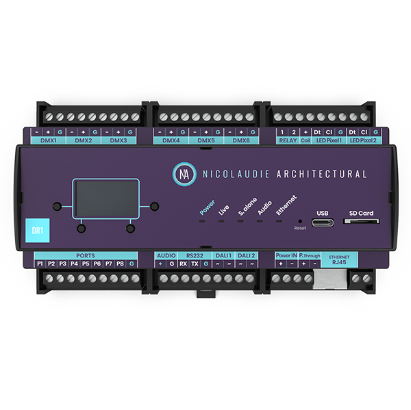The DINA-DR1 is the latest lighting control solution from Nicolaudie Architectural. Our talented R&D team has worked a lot to design this all-in-one controller featuring multiple output protocols, triggering and integration facilities, programmable memory for dynamic lighting sequences, remote control