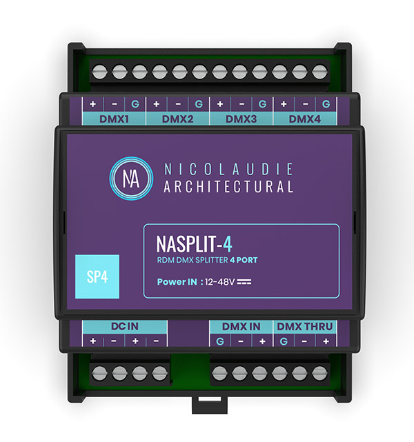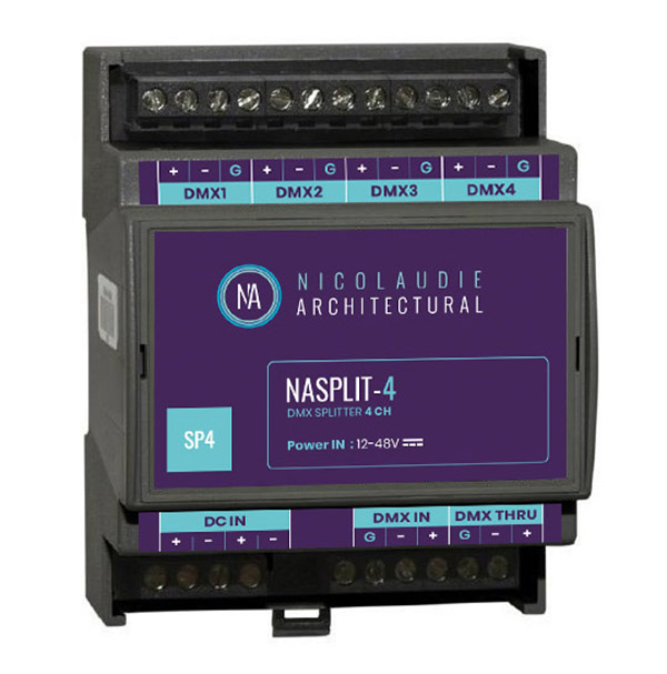 DMX splitters are recommended for lighting control installations. They make the wiring a lot easier by allowing several cables to run from the same output of the DMX controller. They also offer a protection of the DMX line by making each output/input connections fully isolated from each other as well as boosted outputs. Our NASPLIT-4 DMX is RDM compatible and therefore supports RDM configuration of your lighting fixtures.
