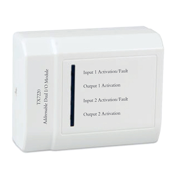 - The TX7220 Addressable Dual Input/output Module is manufactured base on the requirement of EN 54 part 18, European Standard. The unit is aesthetically pleasing with unobtrusive design that will complement modern building designs and its plug-in type assembles make installation and maintenance more convenient to the installer. The unit is compatible to the TX7004 Analogue Intelligent Fire Alarm Control Panel, produced by single manufacture T&A, to avoid addressable communication compatibility problem