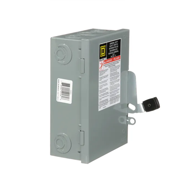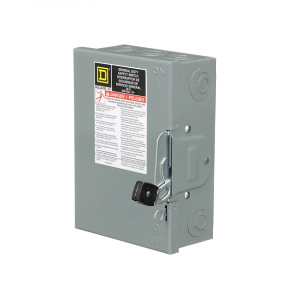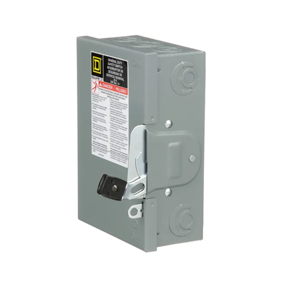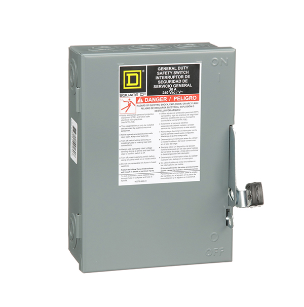 - General duty safety switches are designed for residential and commercial applications where durability and economy are prime considerations. Typical loads include lighting, air conditioning, and appliances. They are suitable for use as service equipment when equipped with a factory installed neutral assembly or field installed service grounding kit. This general duty single throw safety switch is a three pole, 30A, non fusible disconnect with a 240VAC voltage rating. This switch has a NEMA 1 enclosure and is surface mounted. This switch comes with lugs suitable for aluminum or copper conductors. These general duty switches are UL listed