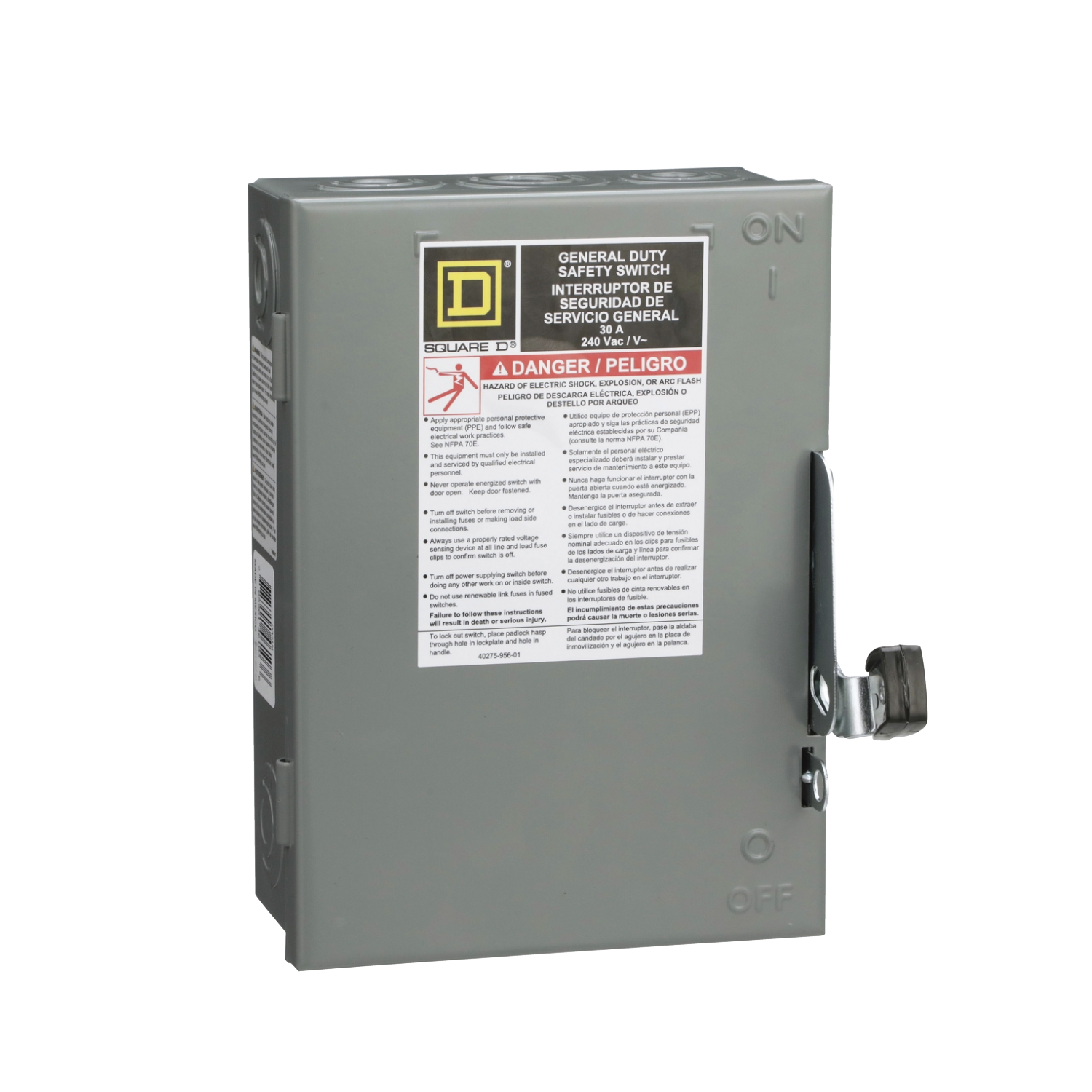 - General duty safety switches are designed for residential and commercial applications where durability and economy are prime considerations. Typical loads include lighting, air conditioning, and appliances. They are suitable for use as service equipment when equipped with a factory-installed neutral assembly or field-installed service grounding kit, as applicable. General duty safety switches are UL® Listed, and meet or exceed the NEMA® Standard KS1. This Single Throw Safety Switch which has a rated current of 30A with a NEMA 1 degree of protection. This fusible disconnect switch comes with a neutral (factory installed). This general duty switch is a 3-pole, 240VAC has a short curcuit rating of 100kA and is surface mounted. This switch has lugs for an electrical connection which will accept AWG 14 AWG 6, copper & AWG 12 AWG 6, aluminium. This switch is certified to UL standards Dinemsions for this product are 9.25 in (H), 7.25 in (W), 3.63 in (D). General Duty safety switchs come with an 18 months warranty.