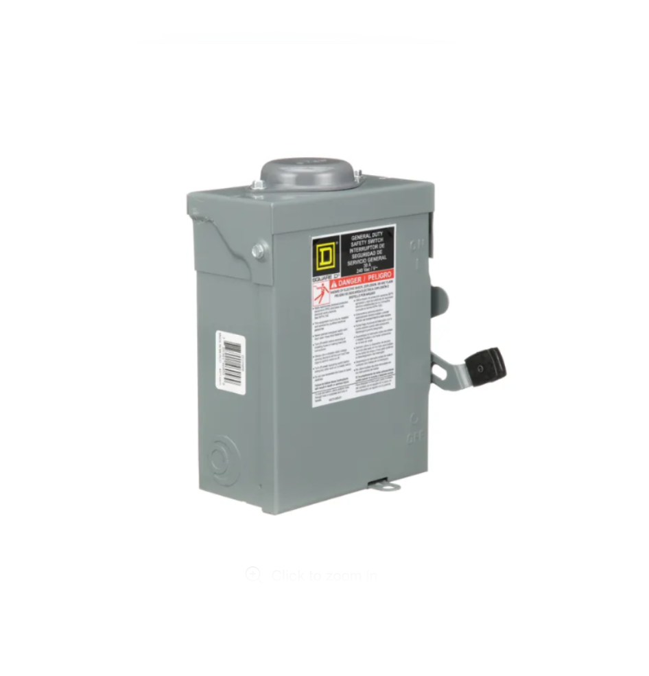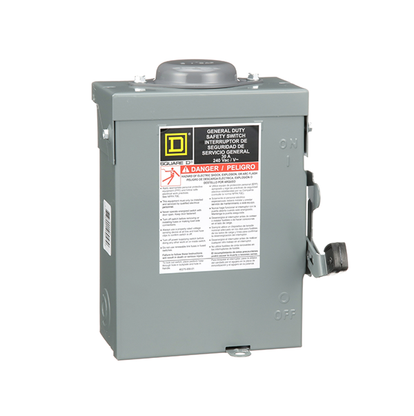 - General duty safety switches are designed for residential and commercial applications where durability and economy are prime considerations. Typical loads include lighting, air conditioning, and appliances. They are suitable for use as service equipment when equipped with a factory-installed neutral assembly or field-installed service grounding kit, as applicable. General duty safety switches are UL® Listed, and meet or exceed the NEMA® Standard KS1. This Single Throw Safety Switch which has a rated current of 30A with a NEMA 3R degree of protection. This fusible disconnect switch comes with a neutral (factory installed). This general duty switch is a 2-pole, 240VAC has a short curcuit rating of 100kA and is surface mounted. This switch has lugs for an electrical connection which will accept AWG 14 AWG 6, copper & AWG 12 AWG 6, aluminium. This switch is certified to UL standards Dinemsions forThis product are 9.25 in (H), 7.25 in (W), 3.63 in (D). General Duty safety switchs come with an 18 months warranty