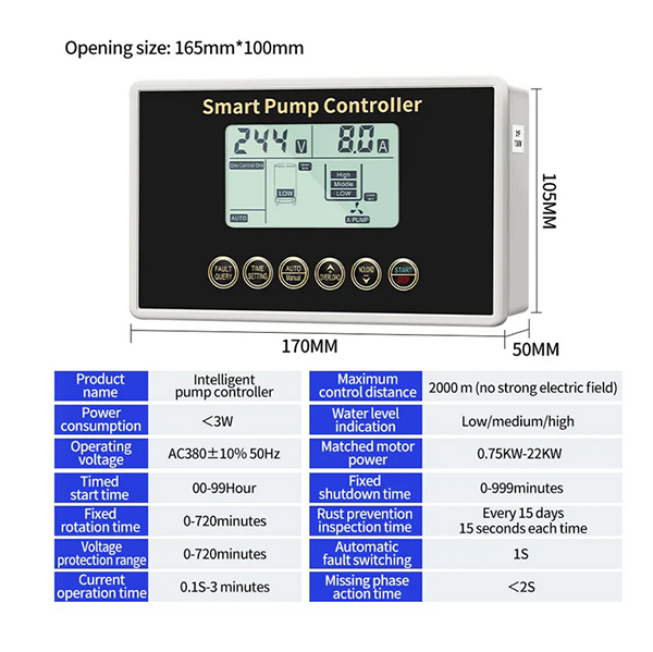 - Automatic re-starting pump from dry running, restart time range 0-720 minutes adjustable.