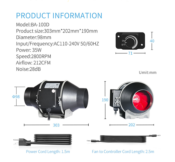Ventilation Fan System with Speed Controller EC Inline Duct Fan