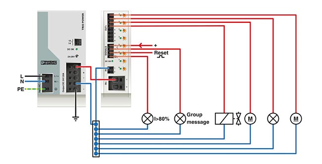 - Multi-channel, electronic circuit breaker with active current limitation for protecting four loads at 24 V DC in the event of overload and short circuit. With nominal current assistant and electronic locking of the set nominal currents.