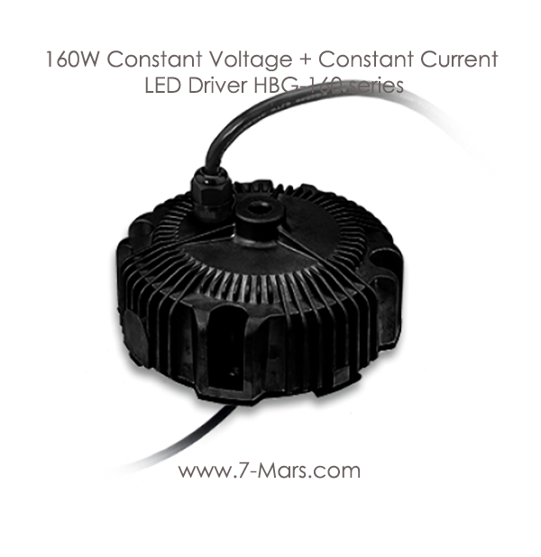 HBG-160 series is a 160W AC/DC LED driver featuring the circular shape design. It operates from 90-305VAC and offers the dual modes constant voltage and constant current output models with different rated voltage between 24Vand 60V. Thanks to the high efficiency up to 93.5%, with the fanless design, the entire series is able to operate for -40°C ~ +85°C case temperature under free air convection. The design of metal housing and IP67/IP65 ingress protection level allows this series to fit both indoor and outdoor applications. HBG-160 is equipped with various function options, such as dimming methodologies, so as to provide the optimal design flexibility for LED lighting system.