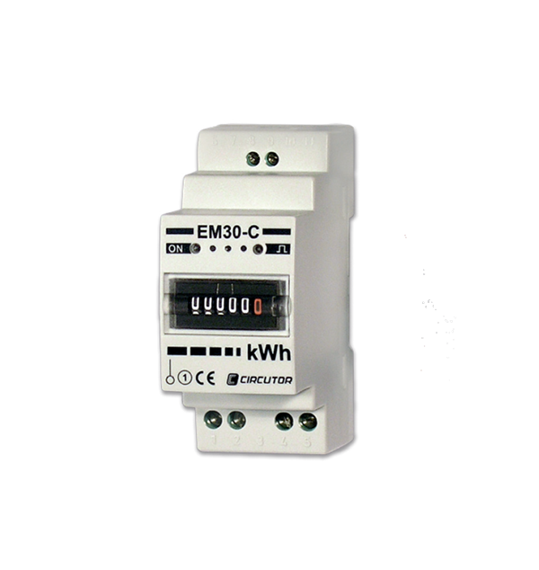 Electromechanical single-phase meters for active energy, with direct connection for DIN rails. Other features include: } Mechanical 6 digit display: 5+1 decimal } Size of 1 module (EMS30-C) and 2 modules (EM30-C) } Indication of a connection error } 1 digital impulse output with optoisolated transistor, for energy consumed