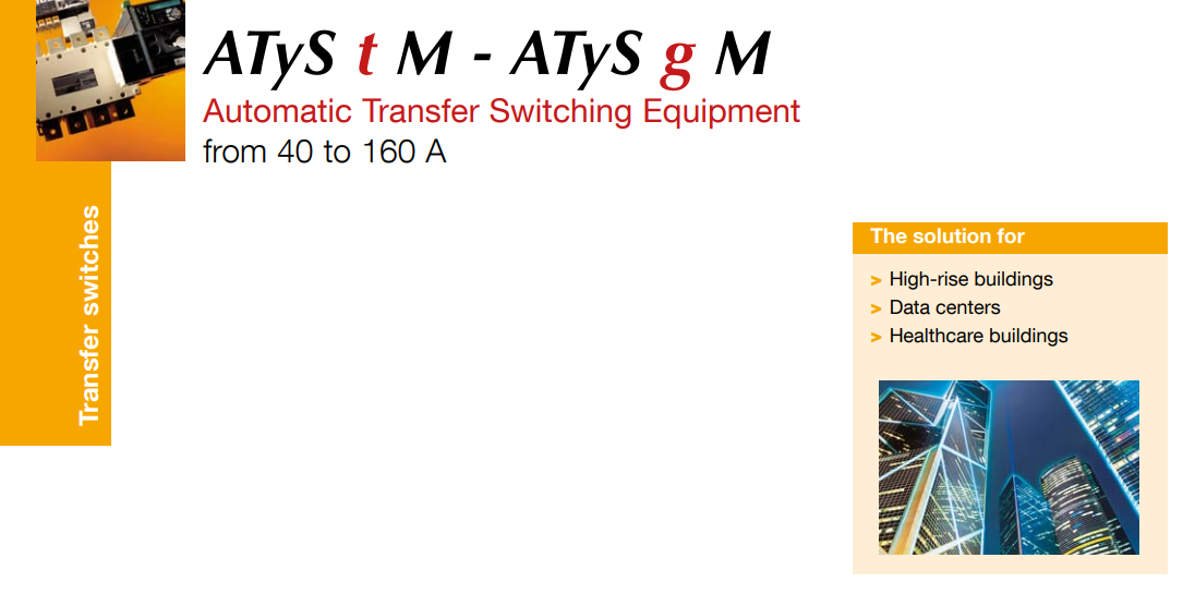 ATyS t M and ATyS g M are modular automatic transfer switches with positive break indication. ATyS t M are 4 pole (three-phase) devices and ATyS g M are 2 or 4 pole (single or three-phase) devices.