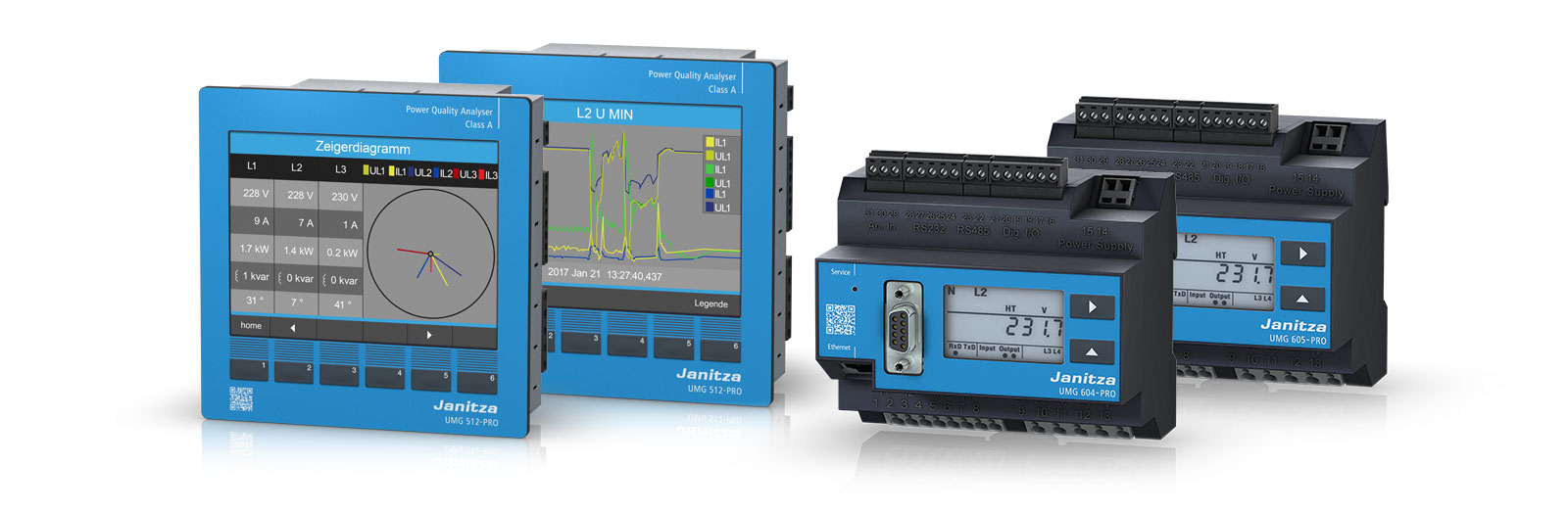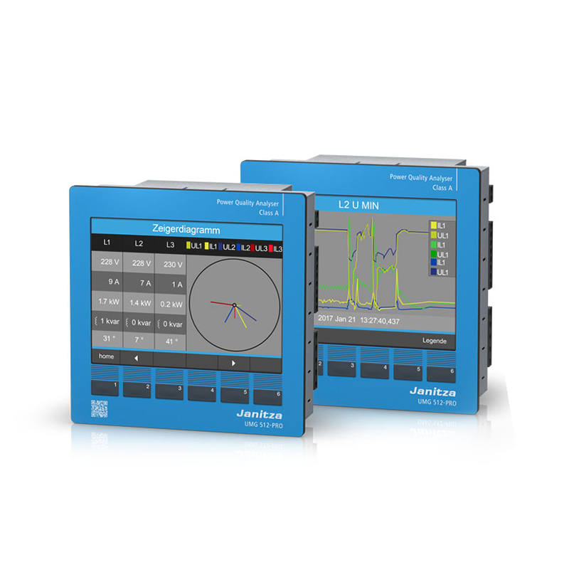The Janitza UMG 512-PRO is particularly well suited to the monitoring of power quality in accordance with current standards, e.g. EN 50160, IEEE519 or EN 61000-2-4.