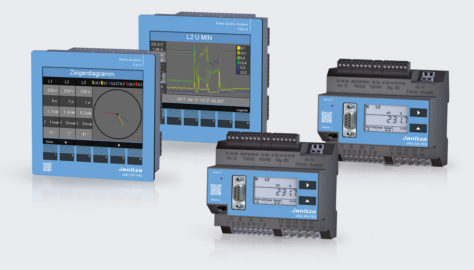 | The new PRO series combines the latest technology with excellent functions and attractive design. The increased variety of functions and comprehensive illustration options enable measurement data and measurement results to be analysed and interpreted more easily. Data can be processed, visualised and analysed with the help of the pre-installed Janitza APPs. APPs are a function extension of the device homepage. The traffic-light principle makes complex power quality analyses, for example, understandable for everyone. |