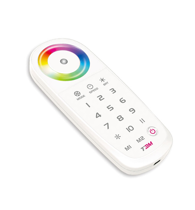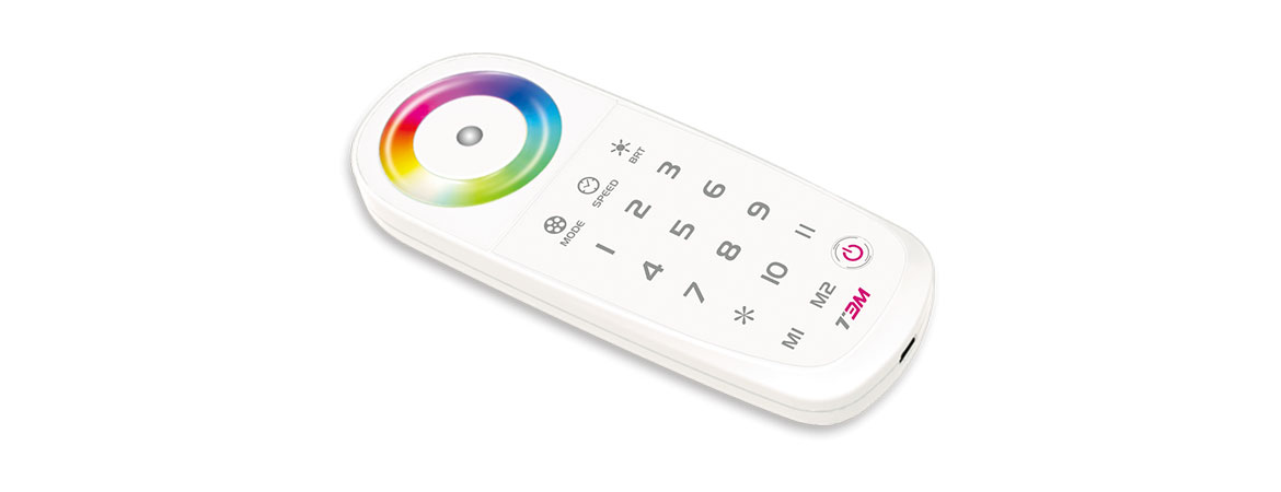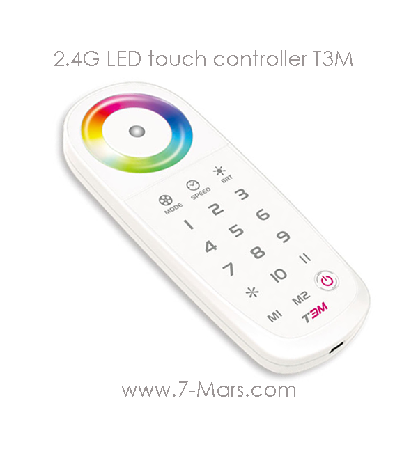 T3M is the 2.4GHZ RF wireless synchronization/zone RGB controller which adopts LTECH multiple global initiate technology. The control system consists of two parts, the RF remote control and receiver, realize the signal synchronization on multiple receivers, zone controlled arbitrarily (not more than 10 zones) within effective distance, a very good solution for the LED project needs sync control wirelessly. User-friendly full-color touch wheel for color selection, unique LED state light for sync change indicated, user can simply know the LED working state from distance by checking the remote control.