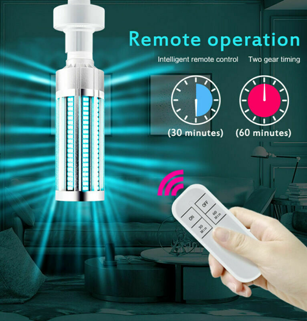 - Remote Control,EASY USE: Can work in any regular screw-in E26/E27 socket, just screw in like a bulb,no cable needed. You can control the light by remote control and set timer 30 or 60 min according to different area zone. more safe and convenient..Covers up to 600 sq.ft. UVC Germicidal lamp suitable for living room, bedroom, kitchen, bathroom, school, hospital, hotel and so on.