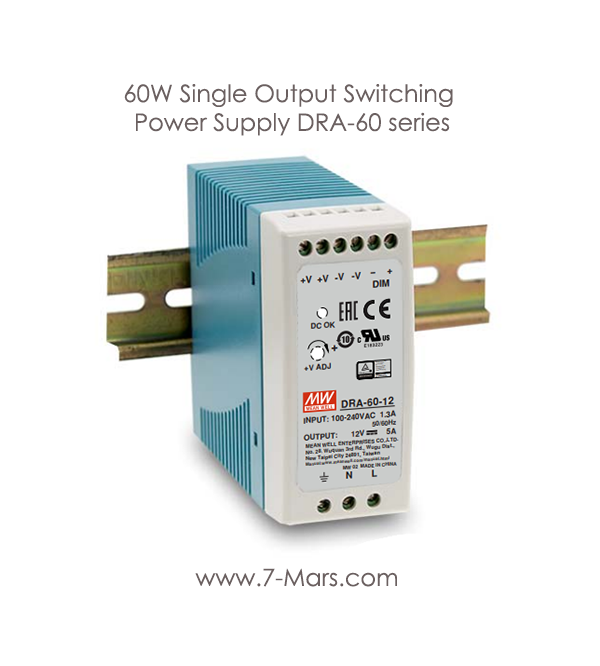 DRA-60 is one 60W AC/DC DIN rail power supply, featuring the adjustable output current. Users are able to easily change the constant output current level, via 1-10Vdc, PWM signal or resistance. DRA-60 can be mounted on DIN rail TS-35/7.5 or 15; in addition, the width of the unit is only 40mm that it is well suited for the installation in a limited spacing. DRA-60 accepts the universal AC input between 90VAC and 264VAC; the efficiency is up to 87% that the entire series can operate, under free air convection, from -30°C through 70°C.