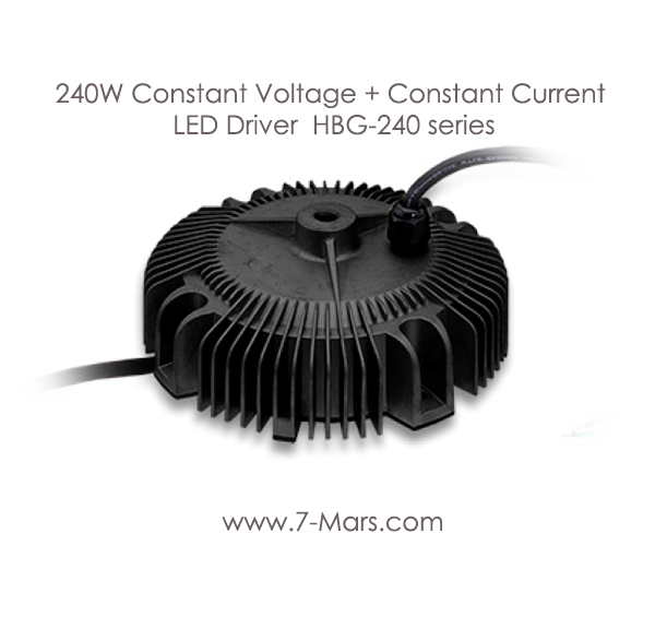 HBG-240 series is a 240W AC/DC LED driver featuring the circular shape design. It operates from 90-305VAC and offers the dual modes constant voltage and constant current output models with different rated voltage between 36 Vand 60V. Thanks to the high efficiency up to 93.5%,with the fanless design, the entire series is able to operate for -40°C ~ +85°C case temperature under free air convection. The design of metal housing and IP67/IP65 ingress protection level allows this series to fit both indoor and outdoor applications. HBG-200 is equipped with various function options, such as dimming methodologies, so as to provide the optimal design flexibility for LED lighting system.