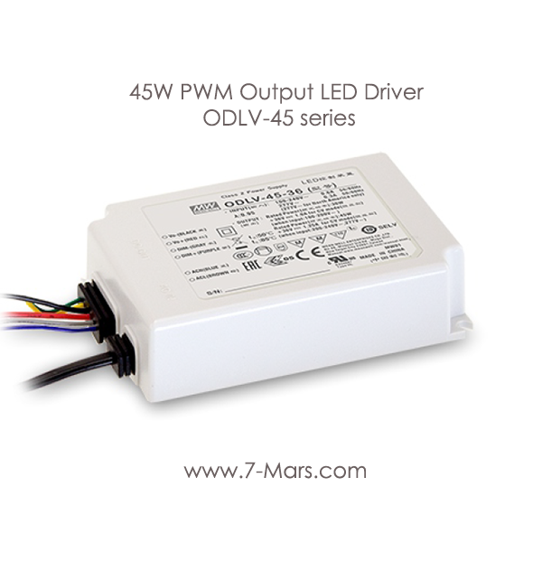ODLV-45 series is a 45W AC/DC LED driver featuring the constant voltage mode PWM style output design. ODLV-45 operates from 90-295VAC and offers models with different rated voltage ranging between 12V and 60V. Thanks to the high efficiency up to 90%, with the fanless design, the entire series is able to operate for -20°C~+85°C case temperature under free air convection. The design of plastic housing and IP67 ingress protection level allows this series to fit indoor wet applications.ODLV-45 is equipped with various function options, such as dimming methodologies, so as to providethe design flexibility for LED lighting system.
