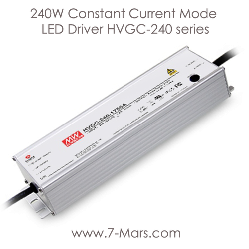 HVGC-240 series is a 240W LED AC/DC LED power supply featuring the constant current mode and highvoltage output. HVGC-240 operates from 180-528VAC and offers models with different rated current rangingbetween 700mA and 3500mA. Thanks to the high efficiency up to 93.5%, with the fanless design, the entireseries is able to operate for -40°C - +90°C case temperature under free air convection. The design of metalhousing and IP67/IP65 ingress protection level allows this series to fit both indoor and outdoor applications.HVGC-240 is equipped with various function options, such as dimming methodologies, so as to provide the optimal design flexibility for LED lighting system.