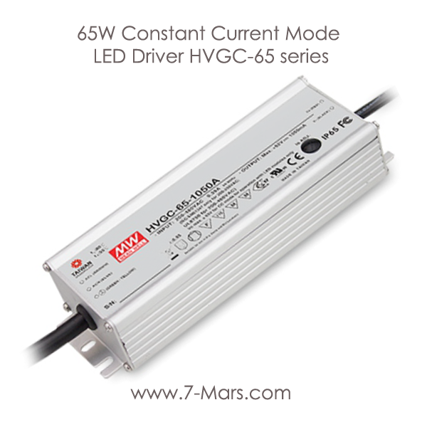 HVGC-65 series is a 65W LED AC/DC LED power supply featuring the constant current mode and highvoltage output. HVGC-65 operates from 180-528VAC and offers models with different rated current rangingbetween 350mA and 1050mA. Thanks to the high efficiency up to 90.5%, with the fanless design, the entireseries is able to operate for -40°C+80C case temperature under free air convection. The design of metalhousing and IP67/IP65 ingress protection level allows this series to fit both indoor and outdoor applications.HVGC-65 is equipped with various function options, such as dimming methodologies, so as to providethe optimal design flexibility for LED lighting system.