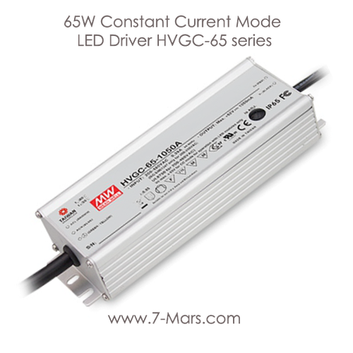 HVGC-65 series is a 65W LED AC/DC LED power supply featuring the constant current mode and highvoltage output. HVGC-65 operates from 180-528VAC and offers models with different rated current rangingbetween 350mA and 1050mA. Thanks to the high efficiency up to 90.5%, with the fanless design, the entireseries is able to operate for -40°C+80C case temperature under free air convection. The design of metalhousing and IP67/IP65 ingress protection level allows this series to fit both indoor and outdoor applications.HVGC-65 is equipped with various function options, such as dimming methodologies, so as to providethe optimal design flexibility for LED lighting system.