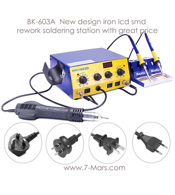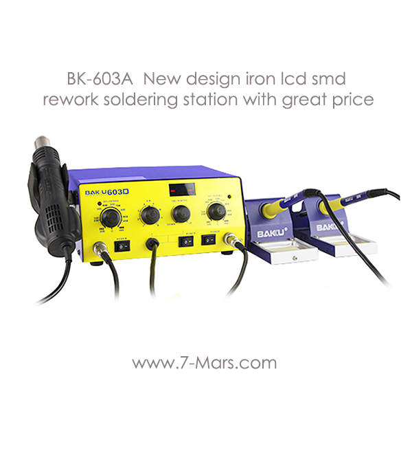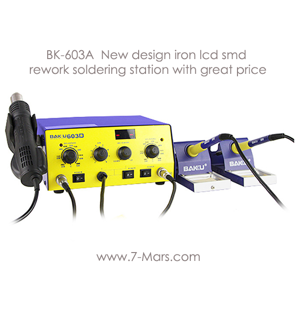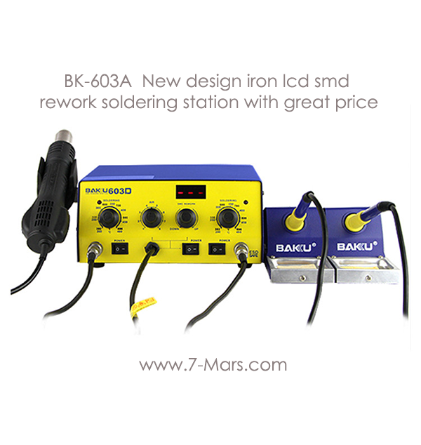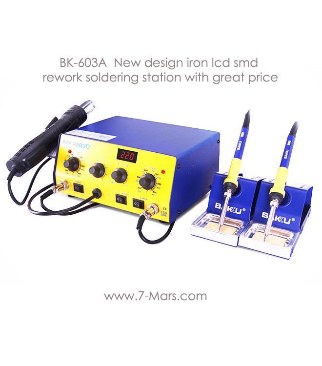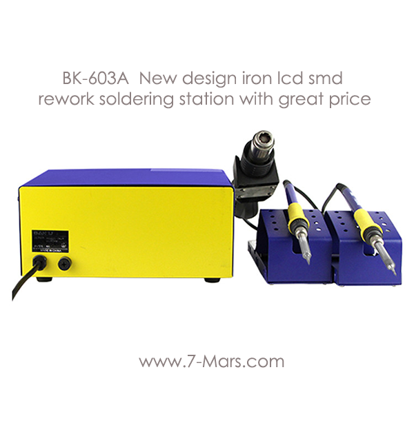 BK-603A SMD Rework Station : BK-603A Brushless fan hot air rework station and soldering station 3 in 1,LED indicator light. Low noise,soft airflow.Suitable for unsoldering multiple component,such as SOIC,CHIP,QFP,PLCC and BGA. Application for hot contraction,heating,depainting,depaining, degluing,defrosting,preheating and soldering. Each part can be used alone.