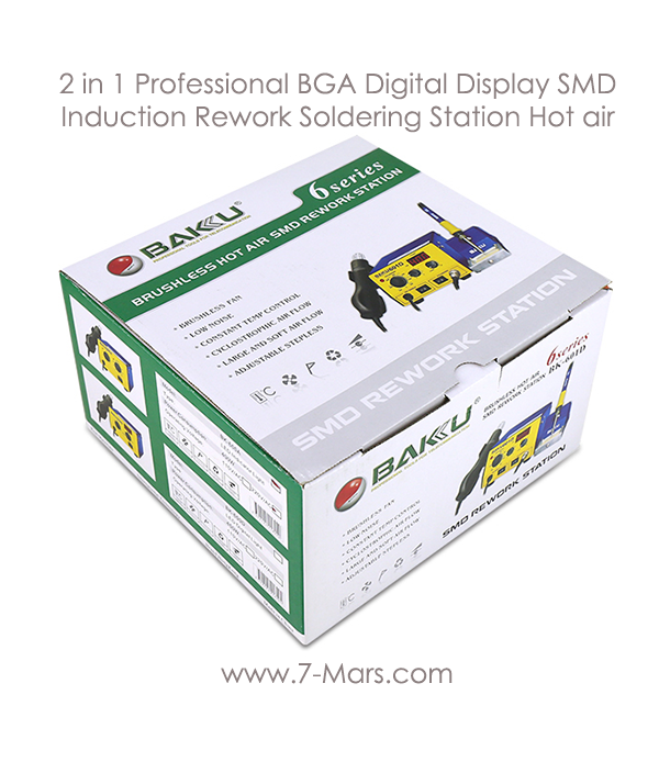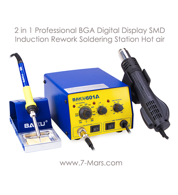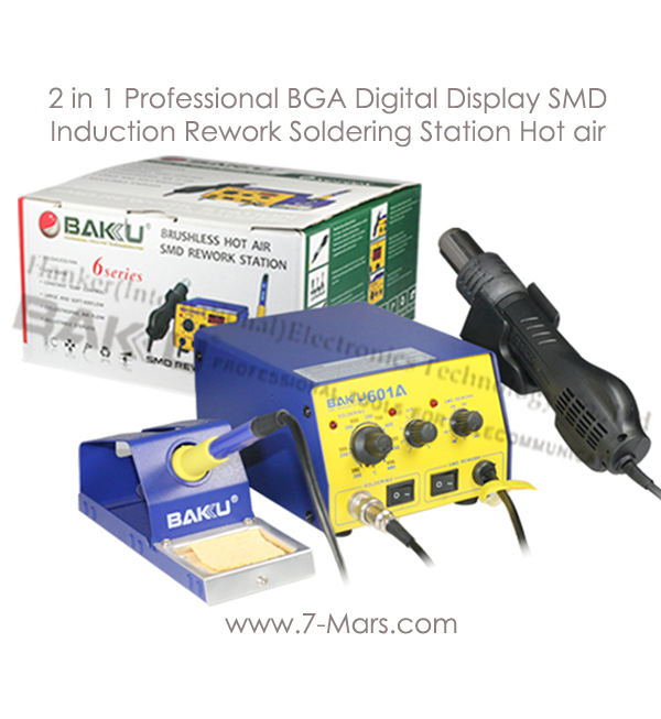 BK-601A SMD Rework station Features: BK-601A Brushless fan hot air rework station and LED indicator light.Low noise,soft airflow. Suitabke for unsoldering multiple component,such as SOIC,CHIP,QFP,PLCC and BGA. Applicable for hot contraction,heater,depainting,degluing,defrosting,preheating.