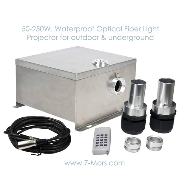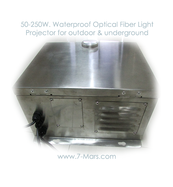 Metal halide waterproof fiber optic light source,is the best choice at wet area,like swimming pool,garden, piazza ,outdoor underground ,building crochet and others places. IP43 stainless steel box will keep