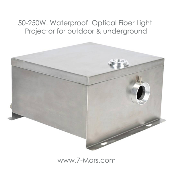 Metal halide waterproof fiber optic light source,is the best choice at wet area,like swimming pool,garden, piazza ,outdoor underground ,building crochet and others places. IP43 stainless steel box will keep