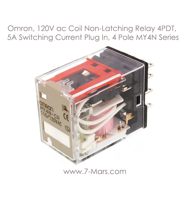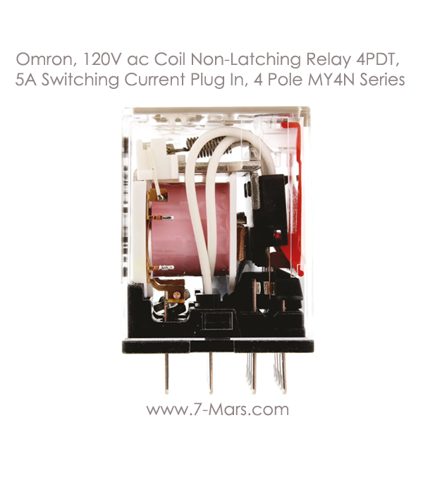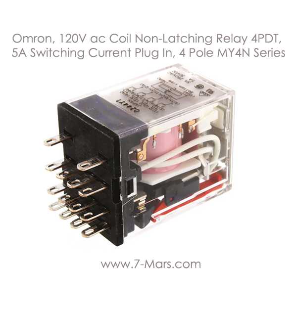 Miniture Relay Omron, 120V ac Coil Non-Latching Relay 4PDT, 5A Switching Current Plug In, 4 Pole