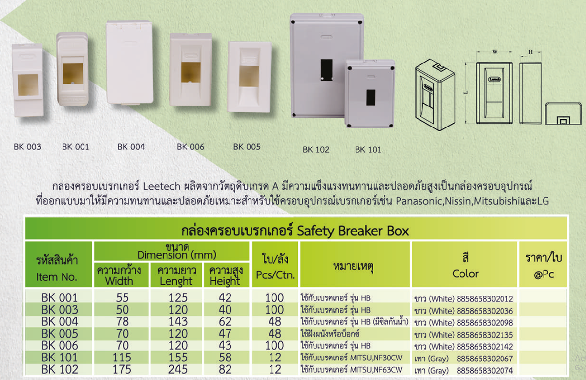เป็นกล่องครอบอุปกรณ์ที่ออกแบบมาให้มีความทนทานและปลอดภัยสูง เหมาะสำหรับใช้ครอบอุปกรณ์เบรกเกอร์ เช่น Panasonic, Nissin, Mitsubishi และ LG