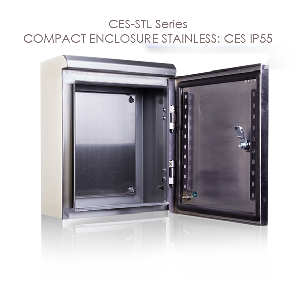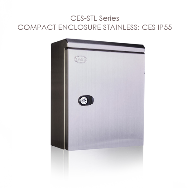 CES-STL IP55. This compact enclosure comes with a canopy that provides extra prevention from the ingress of water spray. This series is suitable for outdoor purposes. It is made of stainless-steel Grade SUS304 which can endure the high humidity environment. Available in 14 standard sizes.