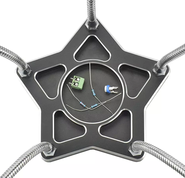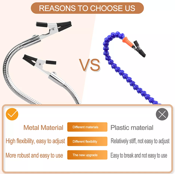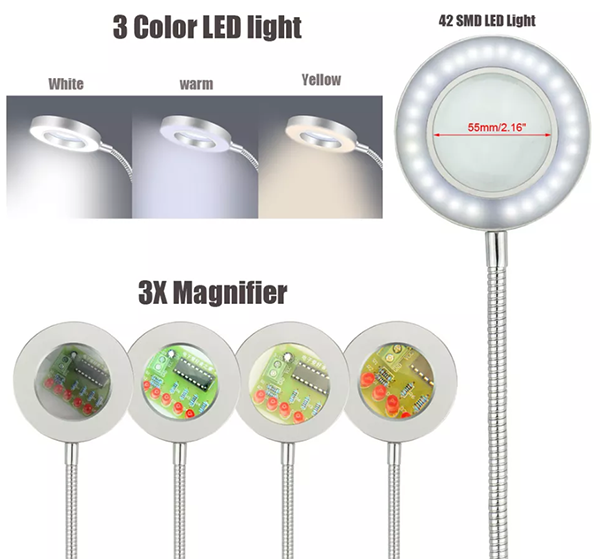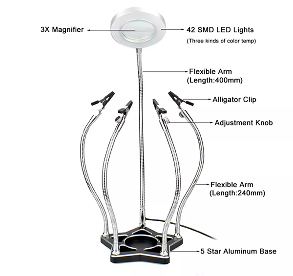1.Heavy Sturdy Aluminum Base -- 5 star Aluminum alloy base,with white soft rubber pad. No worry for tipping over even with a heavy project. 2.No sliding -- with 5 white soft rubber pad,keep the helping had soldering station from sliding around on your bench. 3.5 Adjustable Flexible Universal Arms -- Five flexible helping hands, Universal joint pipe, easily positioned where you want them. Eliminates the frustration of traditional helping hands. 4.360 Degrees Rotated Alligator Clips -- alligator clamps can be rotated 360 degrees then " locked " into place with knurled thumb nuts. 5. Magnifying glass with LED light, the color temperature of LED light can be adjusted in 3 steps and the brightness can be adjusted in 11 steps, it can meet various working environments. 6.Universal -- Perfect for computer boards/ jewelry makers/ arts crafts hobbyists,it can be used universally. |