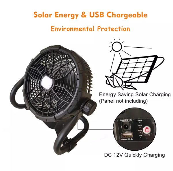 - Usage: Family+outside+camping / Charger: Solar(Panel not including)/USB charging Feature: 360° Adjustable Function: Cooling Air+LED Light