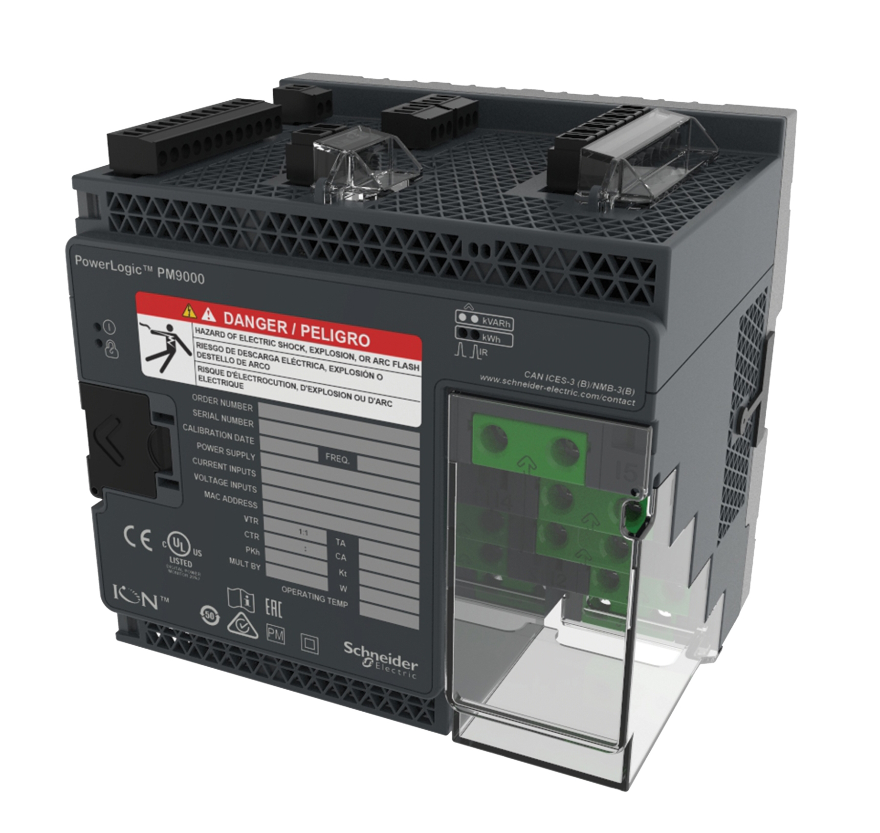 - PowerLogic™ ION9000 เครื่องวัดคุณภาพไฟฟ้าและรายได้ขั้นสูง ส่วนหนึ่งของ PowerLogic ด้วยความแม่นยำสองเท่าของมาตรฐานพลังงานที่มีอยู่ เครื่องมือวัดคุณภาพกำลังไฟฟ้า (PQI) ที่ผ่านการรับรองนี้จึงกำหนดมาตรฐานใหม่เพื่อความแม่นยำ แก้ไขปัญหาคุณภาพไฟฟ้าได้เร็วขึ้นด้วยเทคโนโลยีการติดตามสัญญาณรบกวนที่จดสิทธิบัตรแล้ว และให้โมดูลแยกเฉพาะที่ออกแบบมาเพื่อปรับให้เข้ากับความต้องการด้านพลังงานที่เปลี่ยนแปลงของคุณในปัจจุบันและในอนาคต