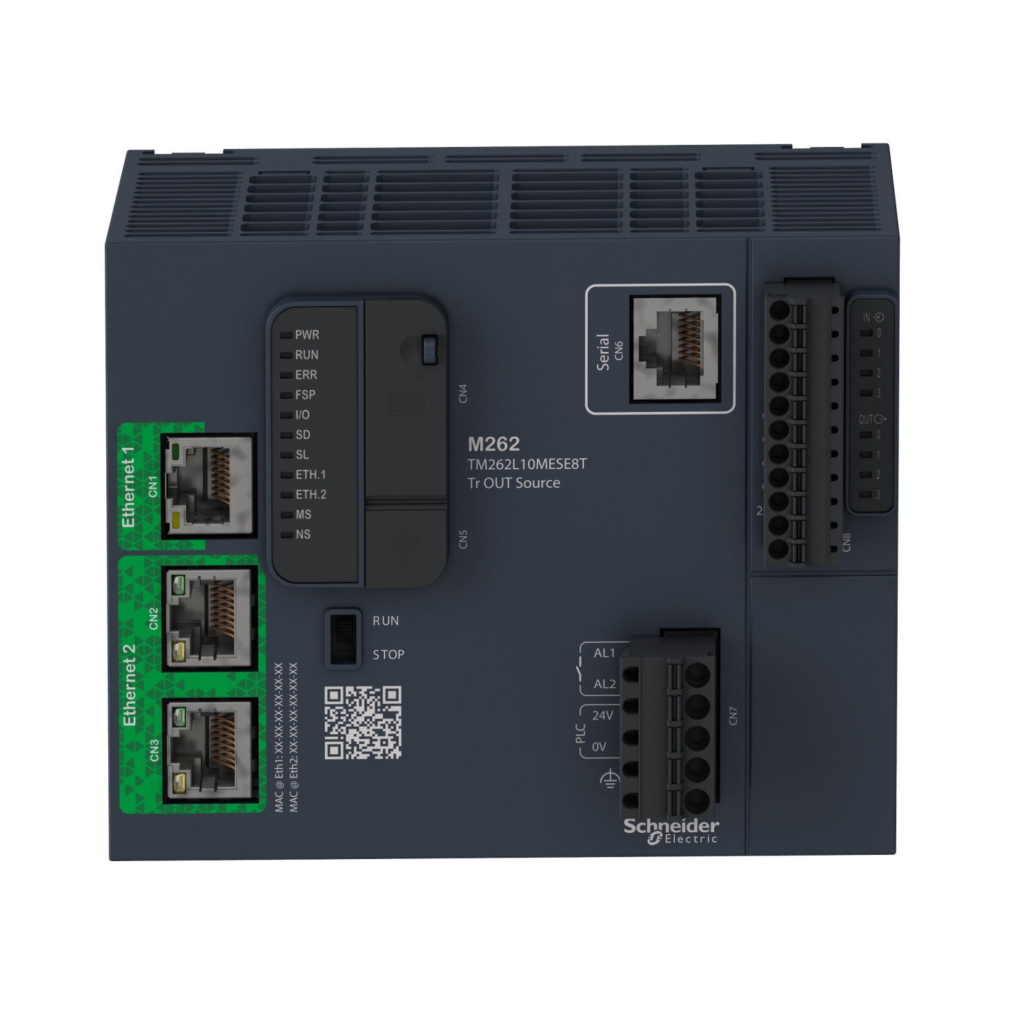 ลอจิกและตัวควบคุมการเคลื่อนไหวที่พร้อมใช้งาน IIoT สำหรับเครื่องจักรประสิทธิภาพ ส่วนหนึ่งของตัวควบคุม Modicon Modicon M262 ที่ฝังโปรโตคอล Industrial Internet of Things (IIoT) และการเข้ารหัสเพื่อมอบการเชื่อมต่อคลาวด์โดยตรงและบริการดิจิทัล