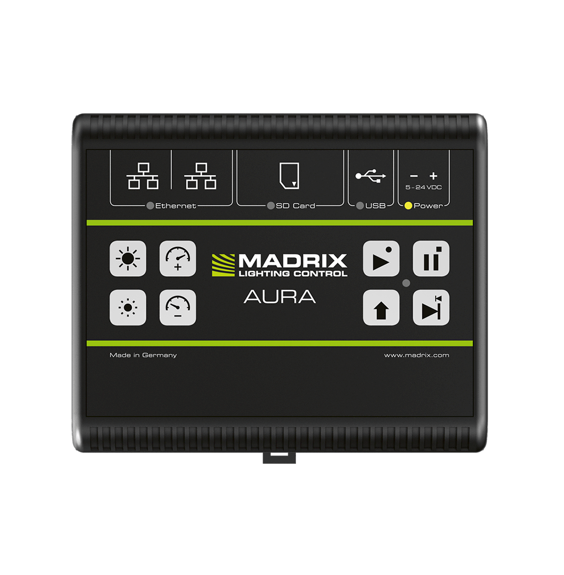 - MADRIX AURA เป็นเครื่องบันทึกขั้นสูงและหน่วยเล่นแบบสแตนด์อโลนสำหรับการจัดแสงของคุณ มีขนาดเล็ก แต่ทรงพลังในคุณสมบัติ บันทึกสตรีมเครือข่าย Art-Net หรือ Streaming ACN MADRIX AURA สามารถเล่นการแสดงแสง เอฟเฟกต์ และภาพที่ซับซ้อนจากการ์ด SD ได้ เรียกใช้เพลย์ลิสต์ตามกำหนดเวลา หรือเรียกฉากภายนอกด้วยเครื่องมืออย่าง MADRIX ORION