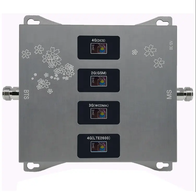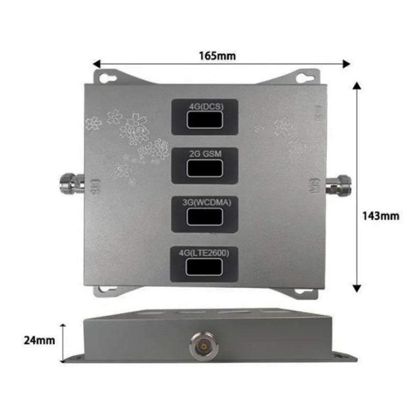 - Product name: Quad Band GSM DCS WCDMA LTE 2G 3G 4G Repeater / Frequency: 900/1800/2100/2600 / Gain: 70±3DB Power: ≥ 20dBm / Power Supply: AC 110-240V; DC 12V/2A