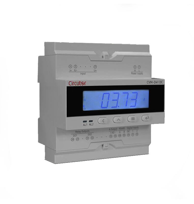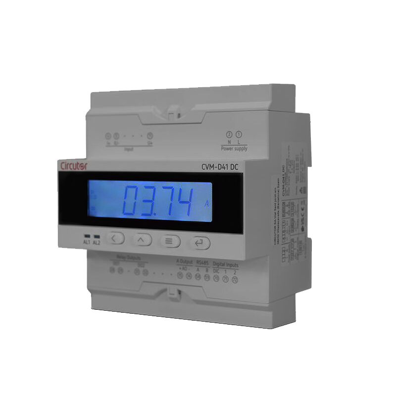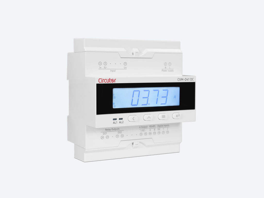 The CVM-D41 DC is a digital power analyzer for installing on a DIN rail. Its screens are operated using buttons to display different electrical parameters in a DC network of up to 1500 VDC, such as voltage, current, power and energy (A·h). This analyzer has the following key features: