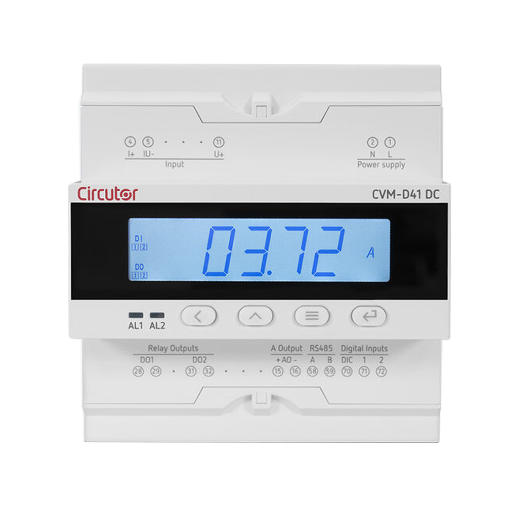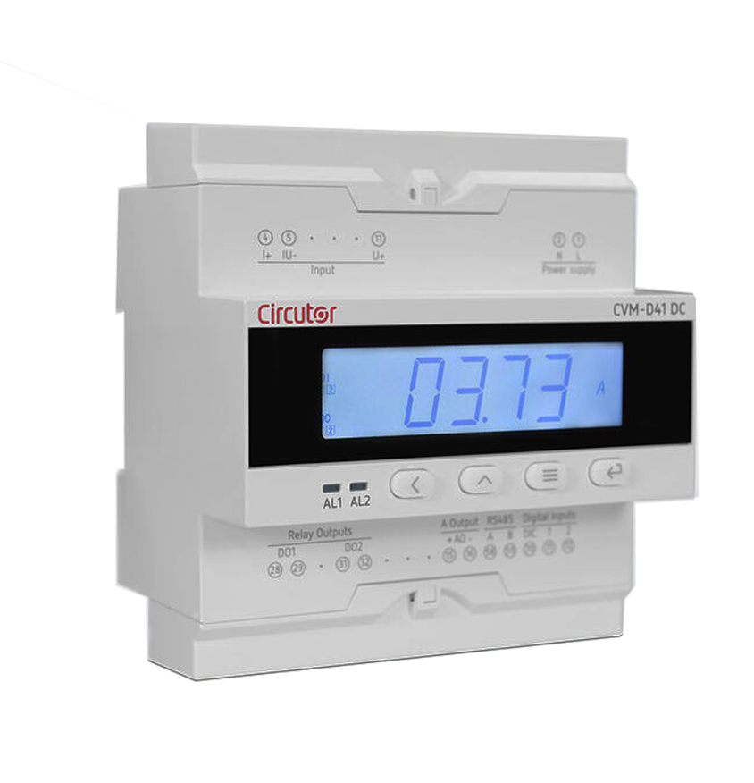 The CVM-D41 DC is a digital power analyzer for installing on a DIN rail. Its screens are operated using buttons to display different electrical parameters in a DC network of up to 1500 VDC, such as voltage, current, power and energy (A·h). This analyzer has the following key features:
