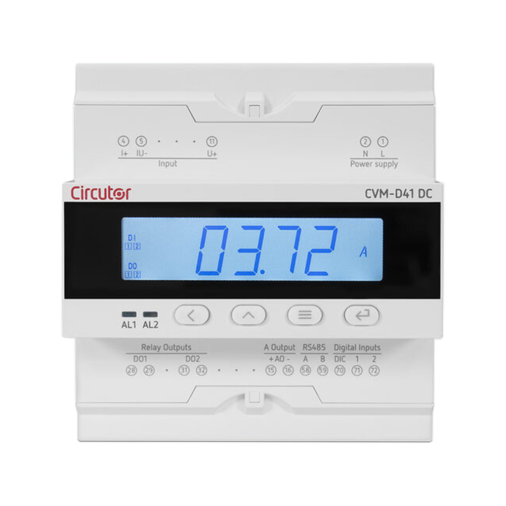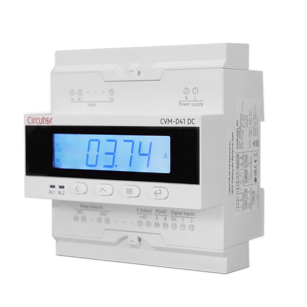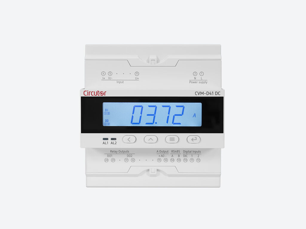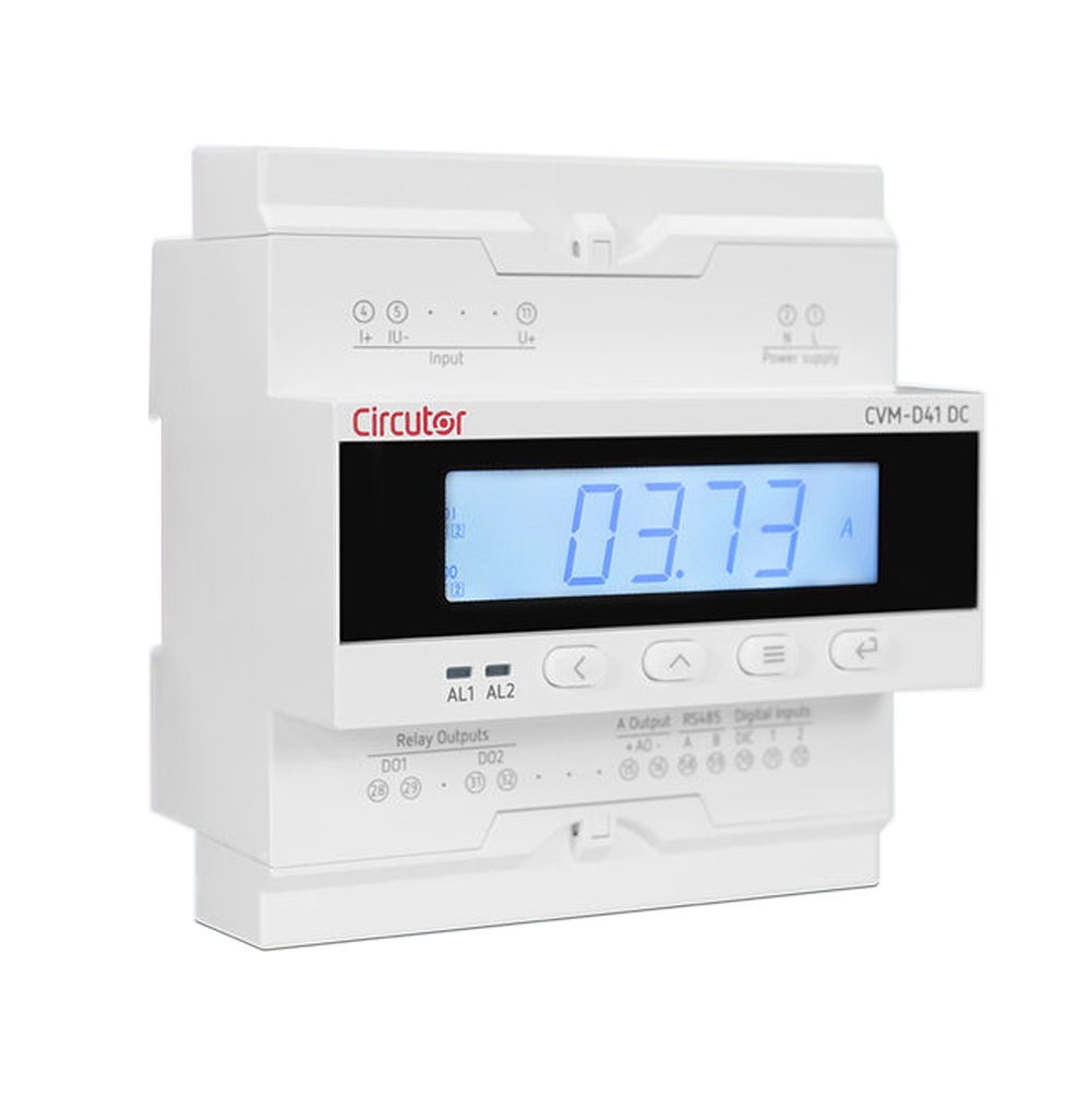 The CVM-D41 DC is a digital power analyzer for installing on a DIN rail. Its screens are operated using buttons to display different electrical parameters in a DC network of up to 1500 VDC, such as voltage, current, power and energy (A·h). This analyzer has the following key features: