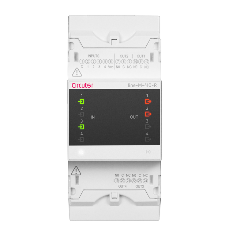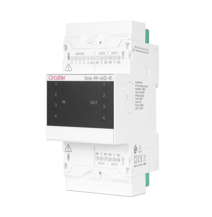 Module with 4 floating relay inputs and outputs. The expansion modules of the Line range provide a simple way to extend the features of any version of line-EDS-Cloud, line-EDS-PS, or of the line-CVM-D32 network analyser. They allow adding digital outputs and inputs, analogue inputs and outputs or any combination thereof, to the devices. The modules are connected laterally and are detected automatically when the lateral connection is made, which greatly simplifies the installation and configuration of the modules. |