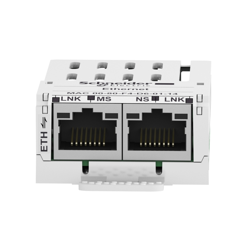 | This Altivar Ethernet TCP/IP communication module has 2 ports with RJ45 connectors. It is compatible with Altivar Machine ATV320, Lexium 32 and Altivar 32. Removable module allows last minute decisions on drive communication protocol and thus facilitates installation project management. |