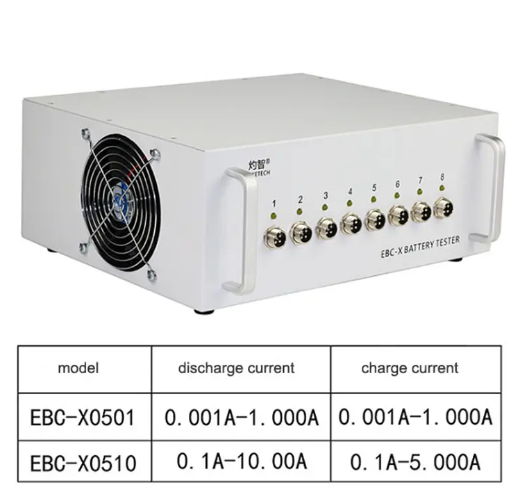 - Model: EBC-X - Voltage Range: 0-4.500V - Voltage Accuracy: 0.1%±0.003V - Current Range: 0.1-10A - Current Accuracy: 0.2%±0.005A - Discharging Mode: CC - Discharging Current: 0.1-10.00A - Discharging Termination: Time/Cut-off Voltage/Manual |